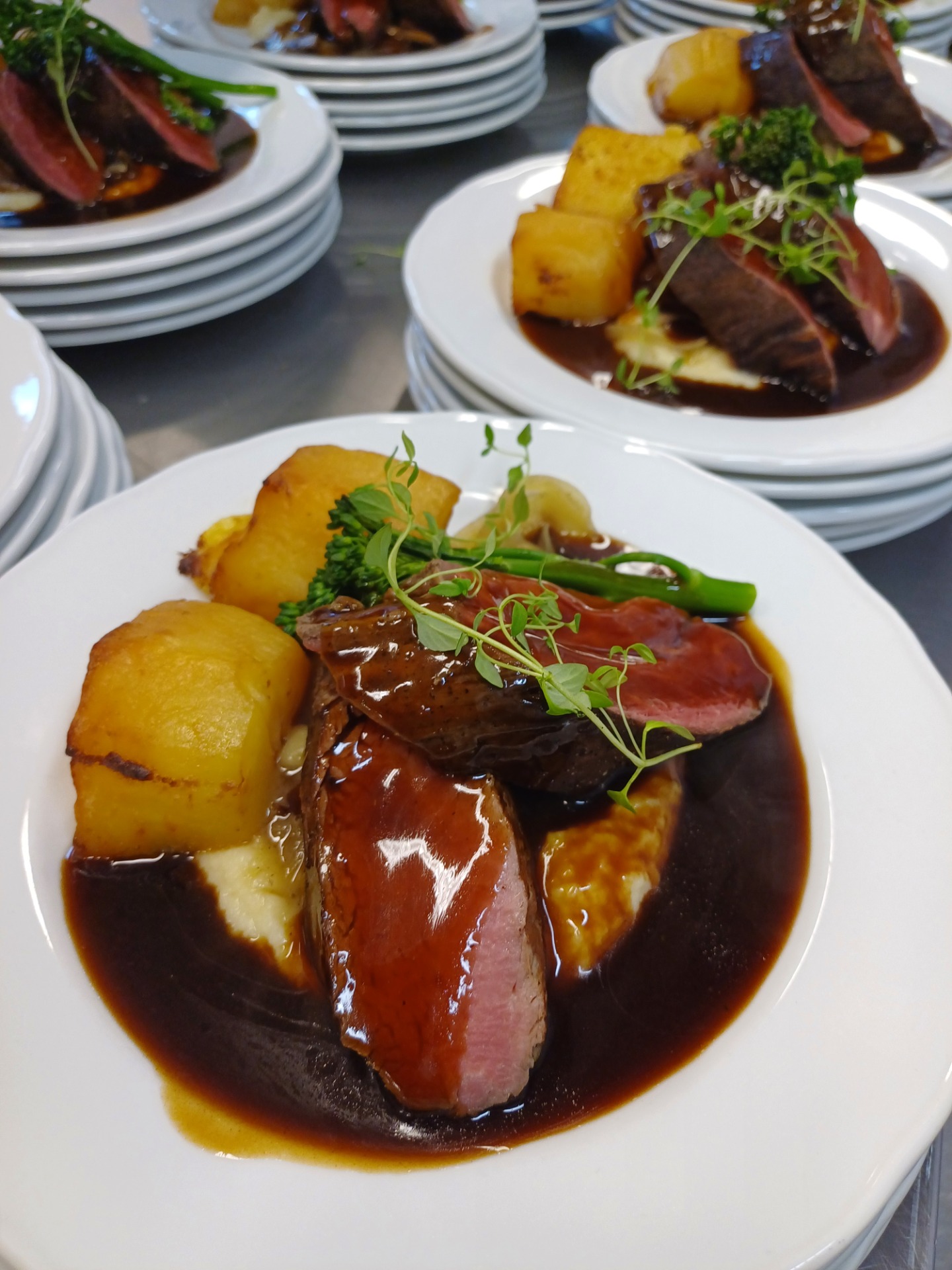 Forretter og desserter leveres ferdig lagt opp på tallerken, og hovedrett varm i varmekasser klar til å transjeres og legges opp.
