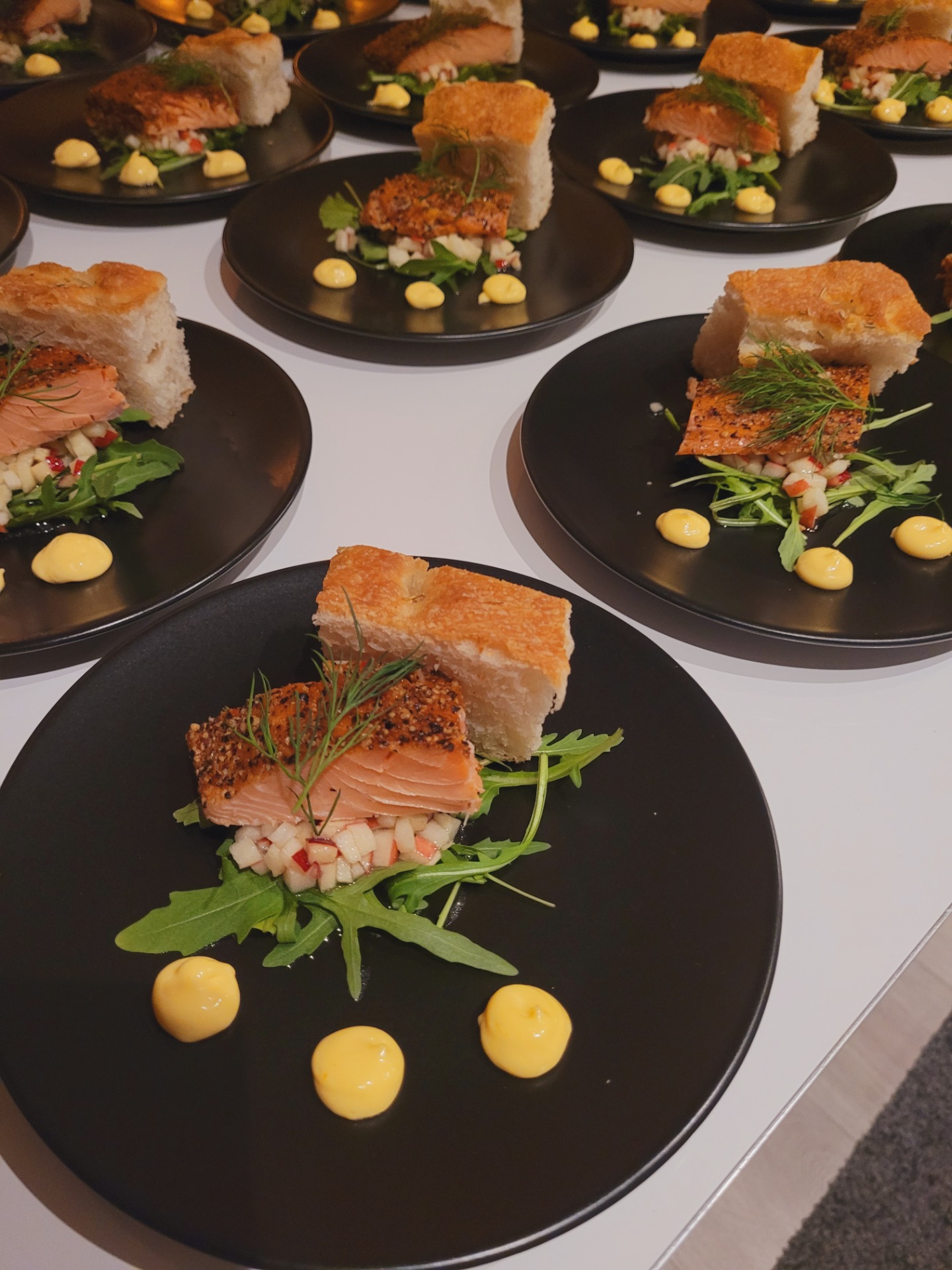Røkt ørret med ruccola, eplevinaigrette, pepperrotkrem og focaccia.